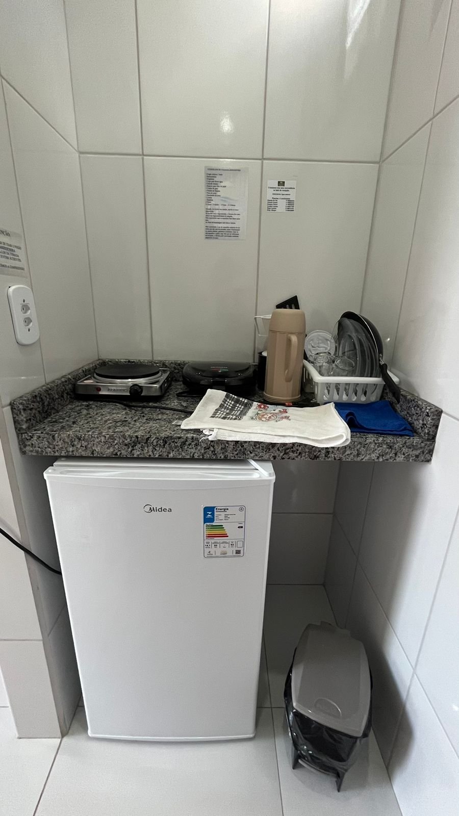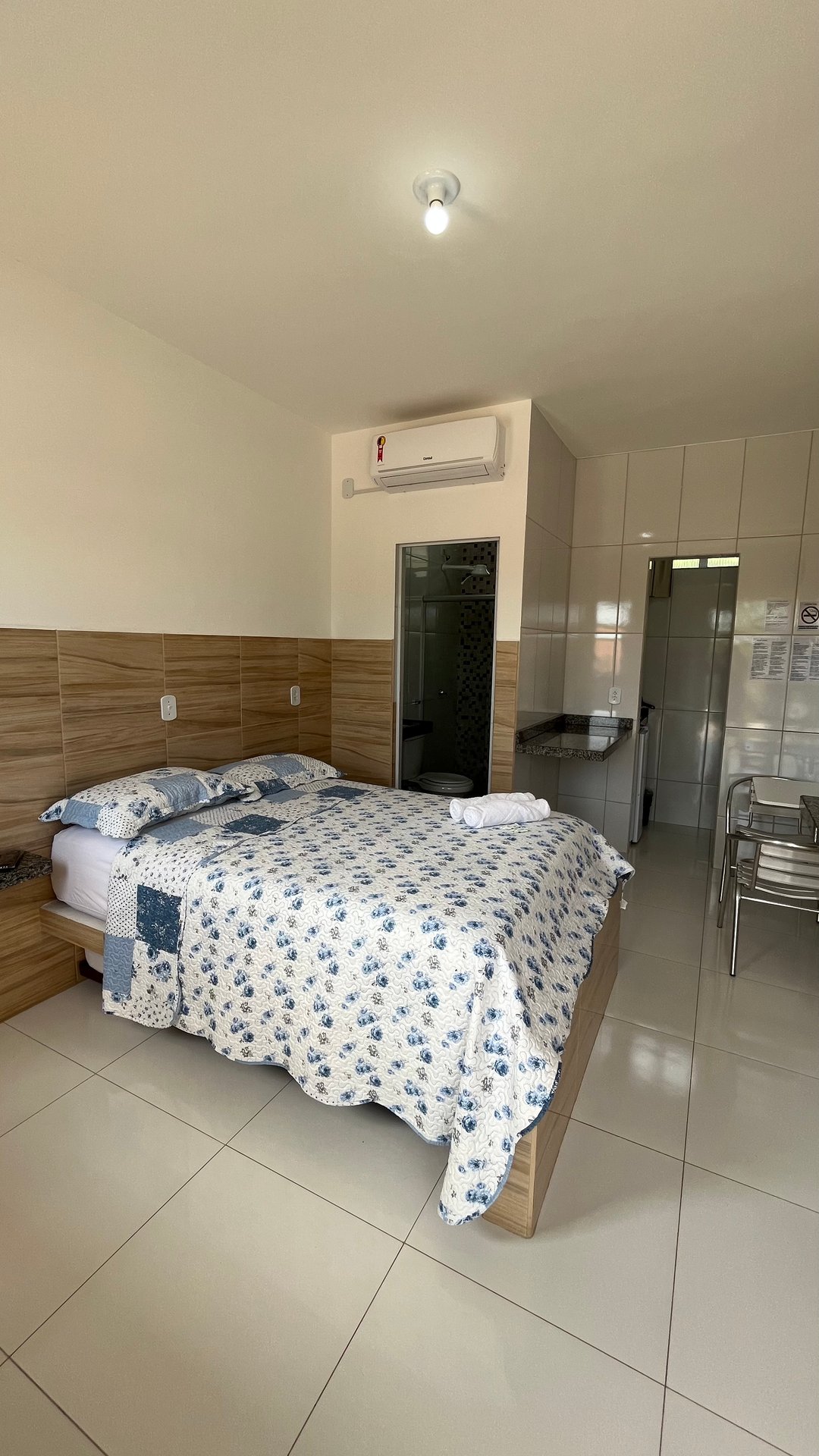 Cama de casal + cama auxiliar de solteiro se houver necessidade. Ar condicionado, frigobar, Tv 32” tela plana, pia e bancada de apoio para refeições…